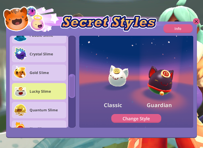 When a slime's cosmetic skin has been unlocked it is automatically applied to slimes of that type. If the player leaves the area before it opens however, the Secret Style will still unlock without a prompt or changing the slime's appearance. Unlocked Secret Styles can be toggled on and off at any time via the Secret Style menu in the Ranch House, and will apply to all slimes of that type. Largos will take active options into account.